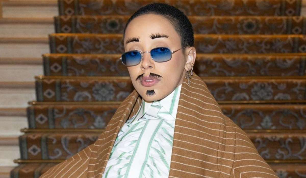 Doca qaşlarına, dodaqlarının üstü və çənəsinə yapışdırılmış kirpiklərlə diqqətləri üzərinə toplamağı bacarıb.