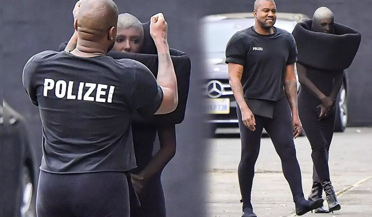 Neylon materialdan hazırlanmış paltar geyinən Biankanı, öz kalqotkası və corab şəkilli ayaqqabısı ilə Kanye müşayiət edib.