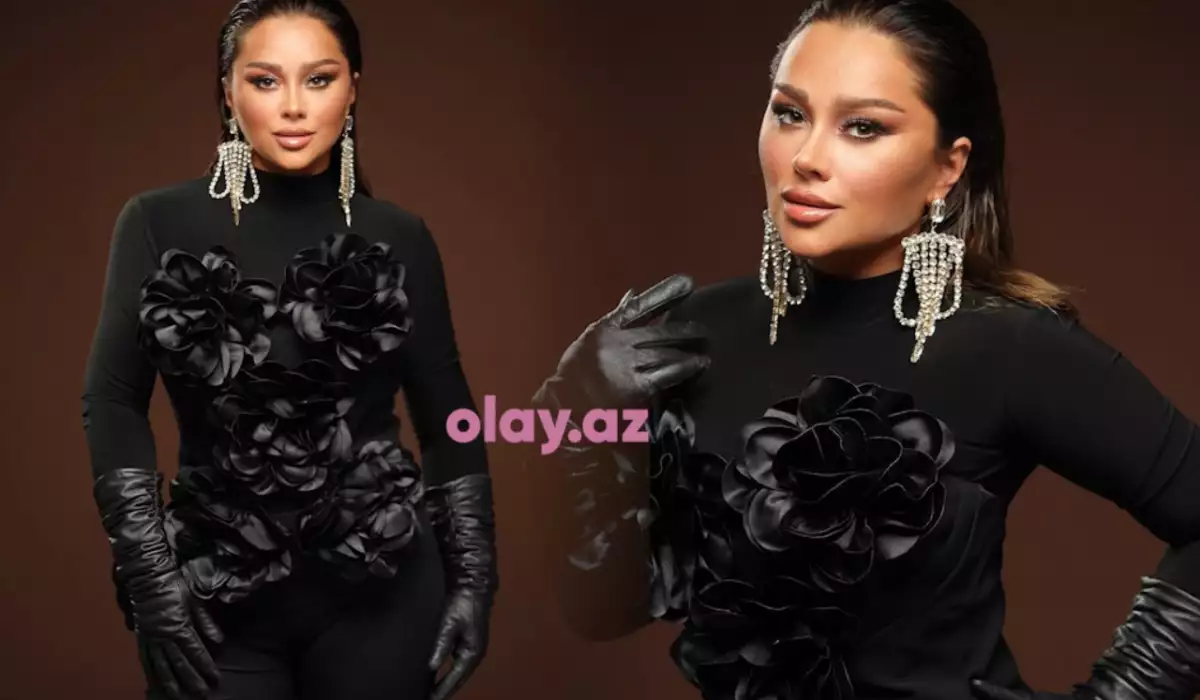 OLAY yazır ki, sənətçi üzəri qara güllərlə bəzədilmiş eyni rəngdə köynək şalvar və dəri əlcəkdə obyektiv qarşısına keçib.