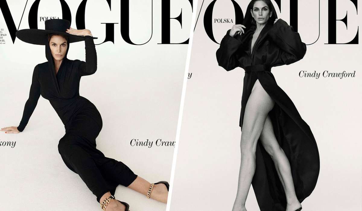 56 yaşlı supermodel dərginin eyni anda iki üz qabığında görünüb. Onlardan birində Krouford başlıqlı paltarda, dar fiqurda, enli kənar papaqda və zəncir formasında tikilmiş stiletto sandaletdə poza verib.