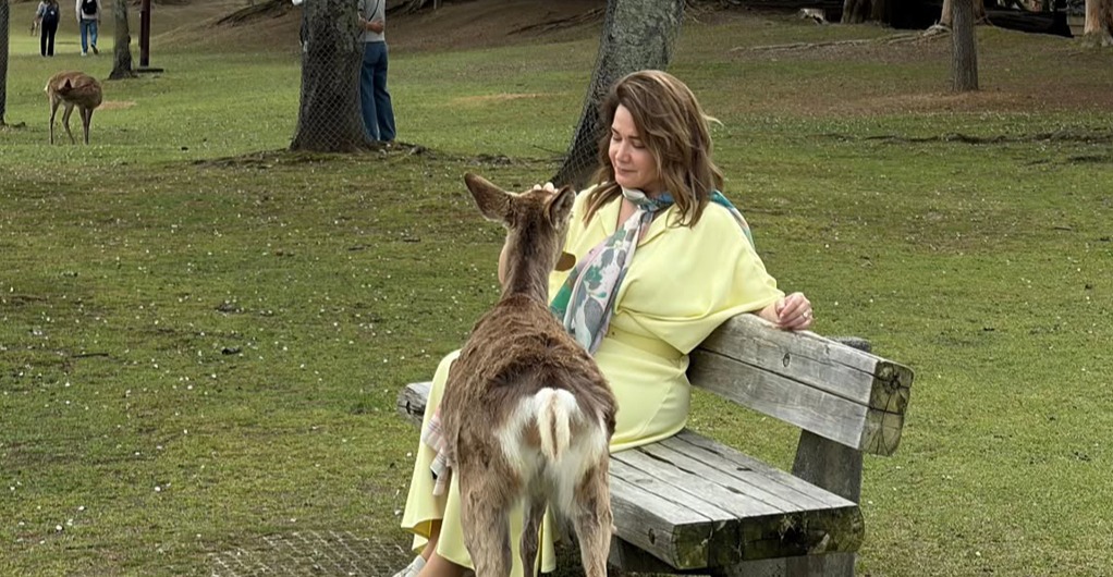 “Yaponiya. Nara şəhəri. Sakura dövrü. Bu məbəddə marallar müqəddəs sayılır. Məbədin qarşısında rahat azad şəkildə yaşayırlar”.